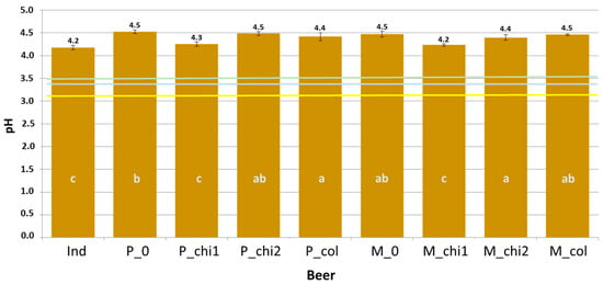 The beers produced in the laboratory with Polish hop varieties exhibited higher pH levels compared with the industrial beer. However, all samples remained within acceptable ranges (Figure 3). All beers had pH values between 4.2 and 4.5. The clarifying agents with chitosan 1 (P_chi1 and M_chi1) resulted in pH values statistically similar to the industrial beer (pH = 4.2). Conversely, beers clarified with chitosan 2 had slightly higher pH values (4.4–4.5) and were not statistically different from most other treatments.