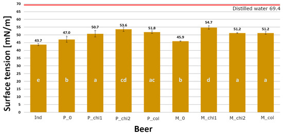 The industrial beer exhibited a lower surface tension compared with the laboratory beers (Figure 4). All of the obtained results were significantly lower than the surface tension of distilled water, to which the measuring device was calibrated.