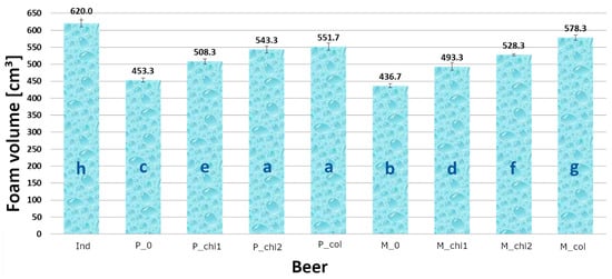 Foam volume of analyzed beer variants (n = 3, α = 0.05; homogenous groups of results within the given parameter are indicated by letters).