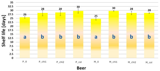 The addition of clarifying agents (regardless of composition) significantly affected the shelf-life results of the beer (Figure 6). In unclarified beers, the shelf-life was shorter by an average of 3.5–4.5 days. The composition of the clarifying agents (with or without chitosan) did not significantly affect the extension of the shelf-life of the produced alcoholic product—the difference between treatments was up to 2 days.