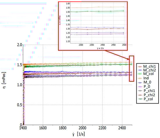 Rheological measurements were performed using a HAAKE Viscotester iQ Rheometer (Thermo Scientific, Waltham, MA, USA). Before starting the measurements, the samples were degassed on a mechanical shaker for 18 h at ambient temperature. During the last half hour of degassing, the samples were stirred using a glass rod. The geometry used was a double-gap concentric cylinder system. For the analysis, a 2.6 cm3 sample was taken. Measurements were performed in triplicate, each time using a fresh sample. The measurements were conducted under controlled rate (CR) conditions. Test settings were selected based on preliminary studies and the measurement ranges of the geometry. Correct settings were those where three consecutive measurements showed a difference of less than 7% [22].