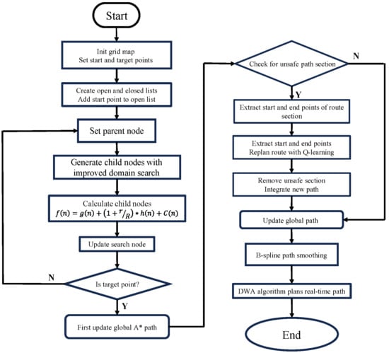 The procedure begins with the initialization of a grid map and the designation of start and goal points. A global path is then generated using the adaptive A* algorithm. Subsequently, a safety evaluation function is applied to identify any unsafe segments within the initial path. If such segments are detected, they are extracted, and corresponding sub-start and sub-goal points are defined. The Q-learning algorithm is then employed to re-plan these unsafe segments, which are used to replace the original portions of the path.