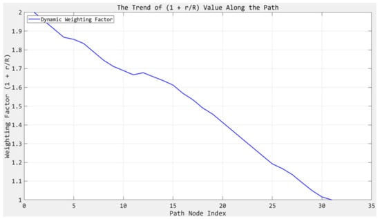 This design adheres to the principle of heuristic admissibility [16], as the weight assigned to the heuristic component never exceeds the actual cost ratio. As a result, the algorithm maintains optimality while improving overall planning efficiency. Figure 3 illustrates the variation in the weighting factor on a 50 × 50 grid map.