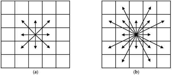 Connectivity methods: (a) the 8-connectivity method is used for node expansion; (b) the 16-connectivity method is used for node expansion.