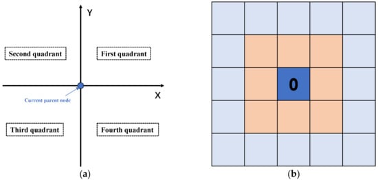 Schematic diagram: (a) the division of four quadrants, where the center point is the current parent node; (b) the inner ring is highlighted in light brown, and the outer ring is highlighted in light blue. The current parent node is represented by a blue square marked with ‘0’.