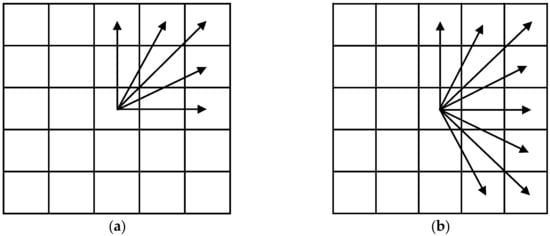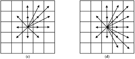 In the A* algorithm, the selection of child nodes is based on the evaluation function f(n), while the neighborhood connectivity pattern directly determines the number of redundant nodes generated. Traditional A* algorithms usually adopt fixed 8-connectivity or 16-connectivity methods, as illustrated in Figure 4a,b; however, both fixed patterns have drawbacks: 8-connectivity tends to generate paths with frequent sharp turns and still samples nodes in irrelevant directions, while 16-connectivity, although reducing the number of turns, leads to an exponential expansion of the search space and computational complexity.