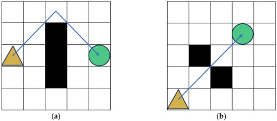 Risky path diagram: (a) collision with vertices of obstacles during path planning; (b) traversal through adjacent obstacles during path planning.