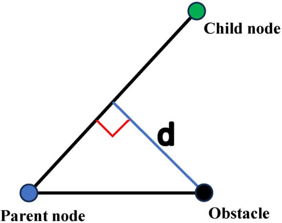 Equation (7) is the safety distance constraint function (which defines the perpendicular distance from a point to a line); when the distance d from an obstacle to the line segment connecting the parent node and the child node is below the safety threshold, the child node is no longer considered.