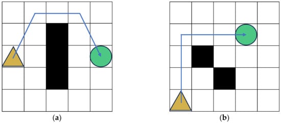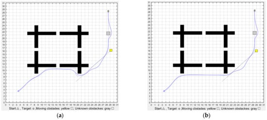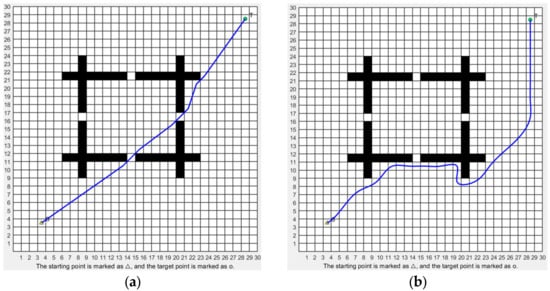 Experimental comparison between the traditional A* algorithm and the adaptive A* algorithm on a 30 × 30 grid map: (a) path generated by the traditional A* algorithm; (b) path generated by the adaptive A* algorithm.