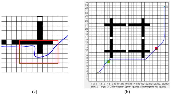 Local path optimization using the Q-learning algorithm: (a) local view of the path generated by the adaptive A* algorithm (from Figure 11b), including the unsafe segments.; (b) re-planned segment using Q-learning, improving safety by increasing clearance from nearby obstacles.