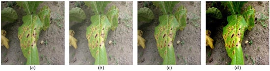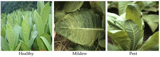 In this study, we used a self-constructed crop disease dataset for model training and validation. The dataset contains a variety of crop disease images collected from the internet, with diverse collection conditions, most of which were taken during the day. The device resolution is no less than 720p. The annotations are based on standardized phenotypic features (such as lesion morphology, color variation, and spatial distribution), ensuring high-fidelity label quality and cross-species consistency. This dataset includes four types of crops: soybean, spinach, tobacco, and lettuce. It covers three label categories: healthy, mildew [], and pest [], comprising a total of 2656 images. Details are shown in Figure 1.