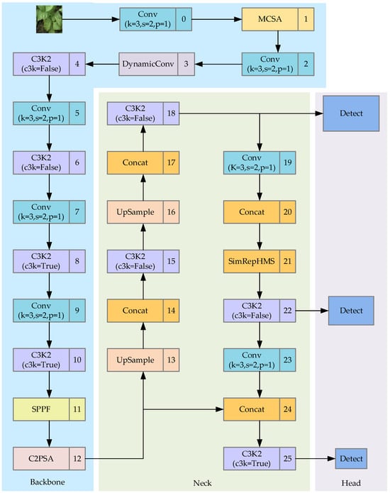 Although the YOLO11 model demonstrates strong performance in general object detection tasks, it still faces certain challenges when detecting crop diseases in complex environments. These issues mainly include the following: insufficient sensitivity to multi-scale features, leading to missed detections; limited feature fusion capability, making it difficult to effectively handle morphologically varied disease lesions; and inadequate bounding box localization accuracy, affecting recognition performance in dense or overlapping areas. To address these problems, this paper proposes the YOLO-MSCM model with several key improvements. Firstly, the backbone is enhanced with an MCSA module that leverages multi-scale spatial perception to better capture and emphasize subtle lesion characteristics. Secondly, a SimRepHMS module is introduced into the neck network to model contextual information through heterogeneous multi-scale structures, improving the fusion effect between multi-level features. Additionally, DynamicConv is integrated into the backbone to enable adaptive channel weighting, thereby improving the model’s resilience and generalization capability in diverse environmental conditions. Finally, the WIoUv3 loss function is used to optimize the bounding box regression process, improving localization accuracy and training stability. The architectural overview of the proposed YOLO-MSCM model is presented in Figure 4.
