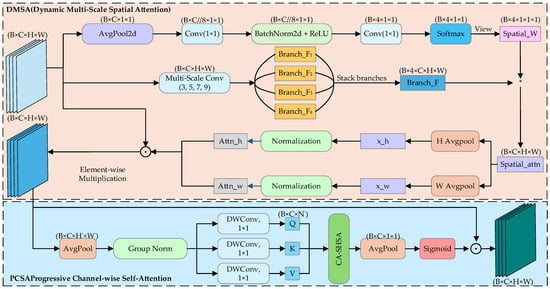 The proposed MCSA (Multi-Scale Channel and Spatial Attention) module improves spatial feature representation by jointly modeling spatial patterns and channel dependencies. It is designed to enhance the model’s capacity to prioritize informative regions in feature maps. The module is composed of two complementary submodules: DMSA and PCSA. A schematic diagram of the MCSA architecture is presented in Figure 5, where B refers to the batch size, C indicates the number of channels, and H × W represents the spatial dimensions of the feature maps.