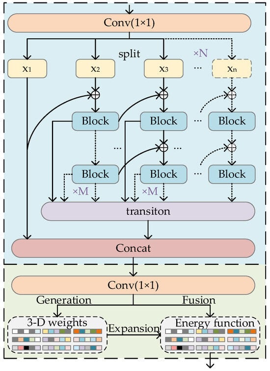 The input features are first transformed in the channel dimension using a 1 × 1 convolution, followed by partitioning into N parallel pathways, each maintaining an equal number of channels. The first branch directly retains the original input features without any processing. Starting from the second branch, the input is sequentially passed through M-stacked blocks. Each block contains multiple depthwise separable convolutions with different kernel sizes, which are used to extract multi-scale spatial features. A cascaded connection is adopted between the branches, allowing subsequent branches to receive partial intermediate outputs from the previous ones, thereby enabling cross-branch information transfer. After all branches have been processed, their outputs are concatenated and then fused and adjusted in the channel dimension through another 1×1 convolution, generating the final output feature map, whose channel dimension is compatible with the detection head or other subsequent modules.