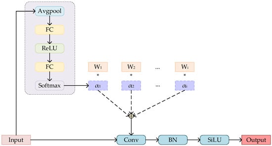 DynamicConv is an adaptive computation method that can dynamically select different convolution kernels based on the input features. Specifically, the DynamicConv module first applies global average pooling to the input data, compressing and fusing the information into a single feature vector. Then, a two-layer multi-layer perceptron (MLP) generates weights based on this feature vector. These weights are used to dynamically combine multiple expert convolution kernels, allowing each input to adaptively select the optimal combination of kernels for processing. This mechanism improves the flexibility and accuracy of feature extraction. Its structure is shown in Figure 7. Such a design is suitable for models that require high adaptability, as it can automatically adjust its behavior across different tasks and inputs. The computational formula is as follows: