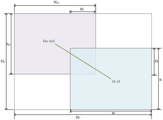 Here, represents the anomaly score of the anchor box, with lower values corresponding to better alignment with the ground truth. is the non-monotonic focusing coefficient, used to reduce the interference of low-quality anchor boxes during training; is a hyperparameter that adjusts the influence of ; (,) and (,) are the center coordinates of the predicted bounding box and the ground truth box, respectively; and denote the dimensions of the smallest bounding region encompassing both the ground truth and predicted boxes; denotes the area of the non-overlapping part between the predicted box and the ground truth box; denotes the IoU-based regression loss for the current anchor box, reflecting the localization discrepancy. The IoU-based loss is computed for the current anchor, and denotes the mean IoU loss computed over the entire set of anchor boxes, serving as a global measure of localization accuracy.