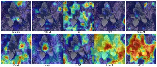To evaluate the effectiveness of different attention mechanisms in the crop disease detection task and further validate the performance advantages of the proposed MCSA module, we incorporated several mainstream attention modules—including CBAM, SE, SimAM, ECA, GAM, Coord, Moga, and SCSA—into the YOLO11 baseline model. All models were compared under the same experimental conditions to ensure fairness. Table 3 presents a summary of the experimental outcomes.