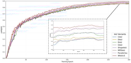 To intuitively compare the impact of different loss functions on model accuracy, Figure 10 was plotted for comparison. As illustrated in the figure, after the same number of training rounds, WIoUv3 exhibits a more stable convergence trend and achieves higher final accuracy, clearly outperforming other loss functions. This indicates that WIoUv3 has better performance in terms of enhancing the learning efficiency of the model and maintaining training stability.