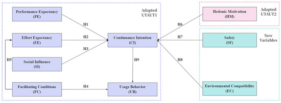 The research model comprises nine constructs: Performance Expectancy (PE), Effort Expectancy (EE), Social Influence (SI), Facilitating Conditions (FC), Hedonic Motivation (HM), Security (SF), Environmental Compatibility (EC), Continuance Intention (CI), and Actual Usage Behavior (UB). Specifically, PE reflects users’ perception of the practicality of drones; EE embodies users’ subjective judgment on the operational simplicity of drones; SI represents the influence of social environment on technology adoption; FC refers to users’ accessibility to necessary resources, services, and technical support during actual drone operation; HM denotes the fun, entertainment, and pleasure experienced by users when using drones in sports; SF refers to users’ subjective perception of whether drones are safe and whether potential risks exist during flight and interaction; EC refers to the ability of drones to operate stably in various sports scenarios (such as different climates, terrains, and lighting conditions); CI denotes users’ intention and tendency to continuously use drone products in sports scenarios in the future; and UB refers to users’ actual usage frequency and behavioral performance of drones in real sports scenarios, serving as the final validation of Continuance Intention.