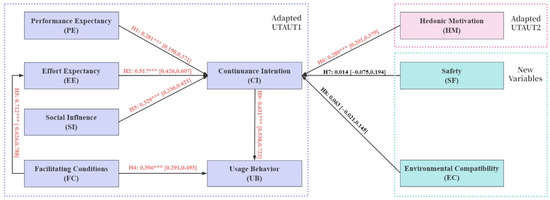 Based on the data results, in general, the respondents showed relatively positive sustained usage intention towards drones, which indicates that there is significant market potential and a user base for the sustainable development of drone consumption in the context of the low-altitude economy. The test results of the hypothetical model indicate that the Performance Expectancy, Effort Expectancy, Social Influence, Facilitating Conditions, and Hedonic Motivation of drone products all have a significantly positive impact on the sustained usage behavior of drones, while Safety and Environmental Compatibility have no significant impact on users’ sustained usage intention. The following is a discussion on the significance of the results of each model hypothesis: