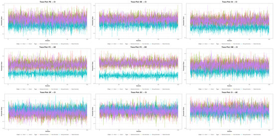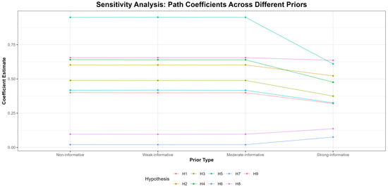 This study set four types of prior parameters for sensitivity analysis. According to Figure 3, the model consistently indicates that it is insensitive to other priors except the strong prior. The estimation results of the moderate prior were finally adopted as the core analysis basis, and its rationality lies in the following: the sensitivity analysis of the four types of priors (non-informative, weak-informative, moderate-informative, and strong-informative) shows that the model exhibits optimal robustness under the moderate-informative prior condition. Under the moderate prior, the coefficient fluctuations of the key hypothesis paths (H1–H9) are the smallest (e.g., the chain fluctuations of H1/H3/H5/H7/H9 are <±0.05, and the chain deviations of H2/H4/H6/H8 are <15%), which are significantly better than the significant deviation (>40% abnormal attenuation) of H8 caused by the strong-informative prior. Combined with the prior parameter setting of moderate effect size (variance 0.3) supported by the literature [36], this prior type has comprehensive advantages in balancing data likelihood and theoretical constraints and ensuring parameter stability, so it is adopted as the final analysis basis.