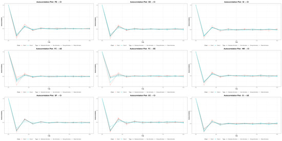 Based on the Bayesian model fitting results in Table 11, all key indices of the research model meet the adaptation criteria: the posterior predictive p-value (PPP = 0.528) is close to the ideal threshold of 0.5, the upper limit of the Bayesian root mean square error of approximation (BRMSEA) confidence interval [0.023, 0.030] is significantly lower than the strict standard of 0.06, the lower limit of the Bayesian comparative fit index (BCFI) confidence interval [0.990, 0.997] exceeds the benchmark value of 0.95, the Bayesian Tucker–Lewis index (BTLI) is 0.992 (medium), the Bayesian normed fit index (BNFI) is 0.956 (good), and the parameter convergence index (PSR = 1.000) fully meets the requirement of <1.05. Moreover, the iteration trace plots (Figure 4)and autocorrelation plots (Figure 5) of the four prior parameters all support that the model has converged, and the comprehensive indices support the model robustness and conclusion validity.