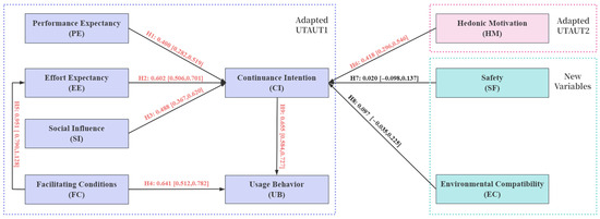 Based on the multiple mediating effects analysis in Table 8, the key results are as follows: The direct effect of Facilitating Conditions (FC) on Actual Usage Behavior (UB) was significant (β = 0.396), and it also produced an indirect effect (β = 0.232) through the chain mediation of “Effort Expectancy → Continuance Intention”, with a total effect of 0.628. Performance Expectancy (PE → CI → UB: β = 0.177), Social Influence (SI → CI → UB: β = 0.208), Hedonic Motivation (HM → CI → UB: β = 0.182), and Effort Expectancy (EE → CI → UB: β = 0.326) all formed significant indirect paths through Continuance Intention, among which the mediating effect of Effort Expectancy was the strongest. The indirect effects of Security (SF → CI → UB: β = 0.009, p = 0.749) and Environmental Compatibility (EC → CI → UB: β = 0.040, p = 0.147) were not significant, and their 95% confidence intervals both included zero (SF: [−0.047, 0.062], EC: [−0.014, 0.091]). All total effect analyses were consistent with the conclusions of direct/indirect paths, confirming that Continuance Intention (CI) is the core mediating variable, while Facilitating Conditions (FC) have both direct and triple chain mediating effects.