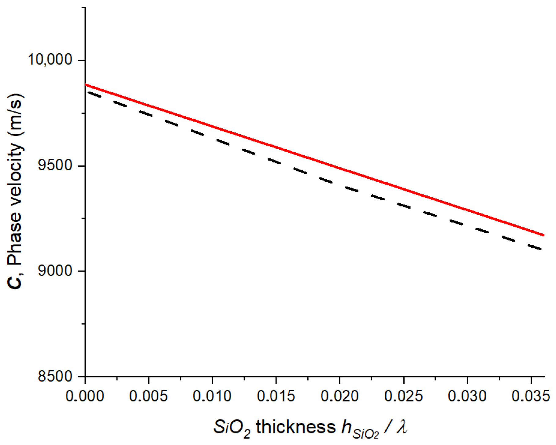 Figure 2. Phase velocity of the S 0 mode versus the thickness of the oxide layer and h A l N / λ = 0.09 for the structure in Figure 1. The red dashed line corresponds to the long-wavelength phase velocity in Equation (2) (where the IDT contribution is neglected). The continuous line represents the full calculation including the IDT (Figures 3 and 4 in [12] and Figure 3 in [13]).