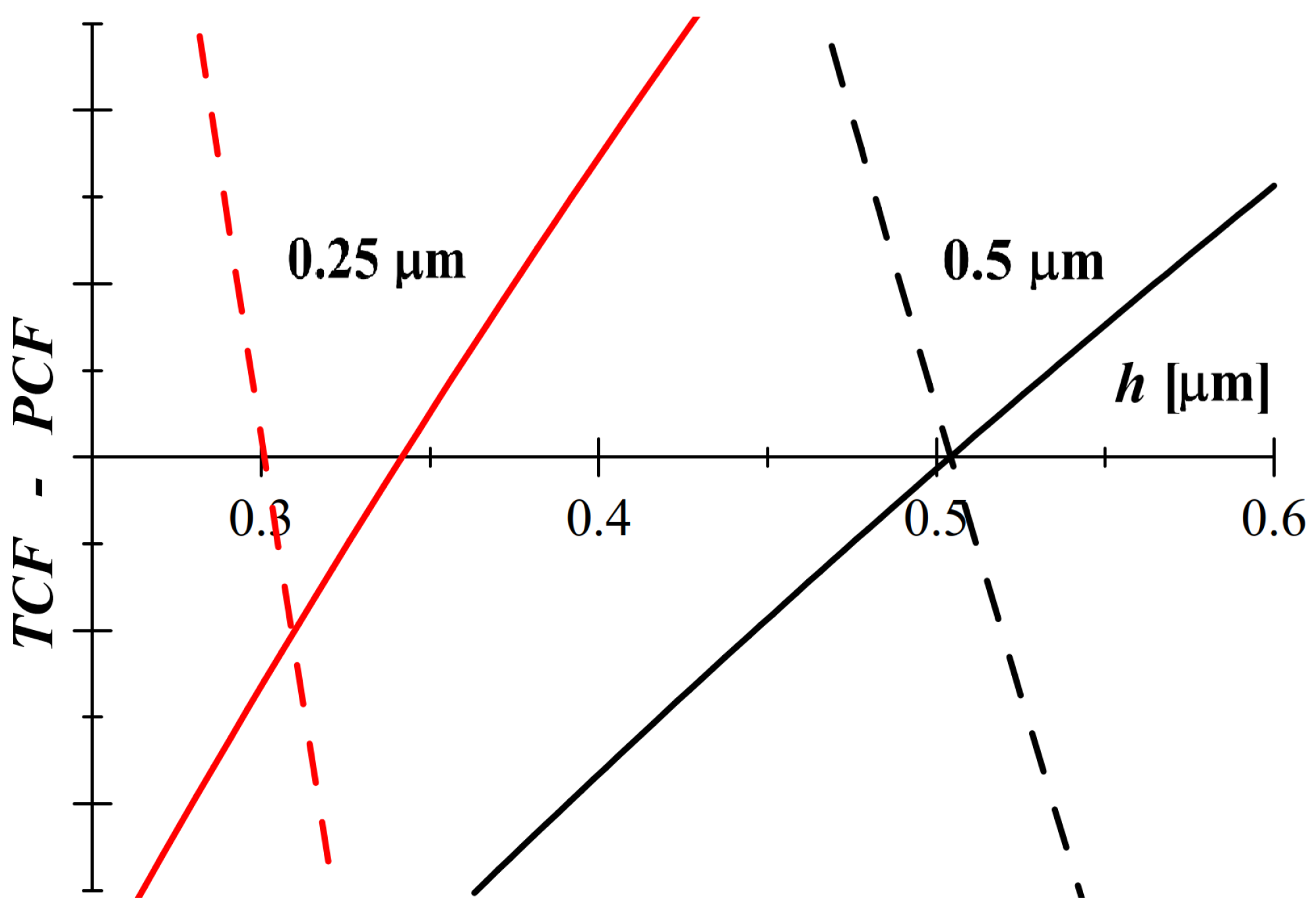 This proves the possibility of realizing a dual-factor T , P stabilization. It turns out that the fully compensated structure corresponds to aluminum nitride and glass layers of nearly the same thickness and a much thinner aluminum layer. In contrast to the single-factor stabilization, it is crucial that all the ratios are fixed at specific values. Indeed, following the example in Figure 3, we consider in Figure 4 the behavior in the vicinity of the optimal configuration (Equation (12)). For the thickness h A l N = 0.5 μ m, we fixed one of the ratios, h A l N / h A l , according to configuration in Equation (12). We can see that the two curves P C F ( h ) and T C F ( h ) crossed zero at the same value of h (thickness of the silicate layer), which corresponds to the other ratio in the optimal configuration, where h A l N = h S i O 2 = h = 0.5 μ m. However, when we took h A l N = 0.25 μ m and kept the same thickness of the aluminum layer, the pressure compensation occurred at a lower h than the temperature compensation.