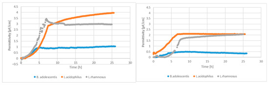Permittivity signals of living cell-number sensors with and without alginite supplementation.