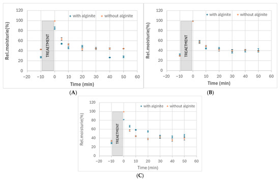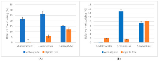Relative skin moisture changes in time after treatment with cell lysates of B. adolescentis (A), L. acidophilus (B), and L. rhamnosus (C) fermented either with alginite or without it.