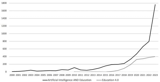 In the educational context, the use of AI has begun to be studied in-depth more intensively over the past decade, given the evolution and consolidation of generative AI, which shows enormous potential for improving the quality of teaching and assessment, as well as for personalizing learning [4]. Considering the above, it is worth mentioning that these topics have been broadly and increasingly addressed in educational research over the past two decades, particularly since 2020, as a consolidated trend following the COVID-19 pandemic. The growth of research in these areas is shown in Figure 1.