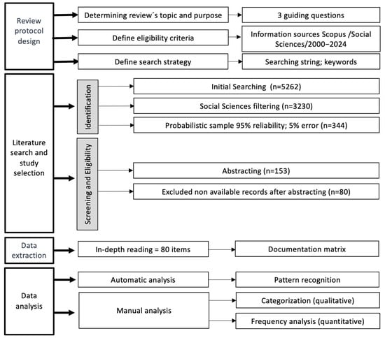 In the second step, only documents with complete full-text access were retained. This ensured that the analysis would be based on comprehensive and verifiable data. The resulting 80 articles were deemed eligible for inclusion and were subjected to an in-depth reading process. This close reading was aimed at extracting the information relevant to the three guiding research questions, while also identifying contextual and methodological details not evident in abstracts alone.