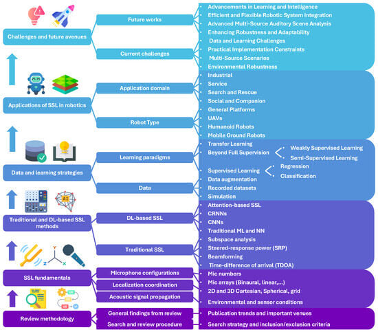 This review fills the gap in other surveys by reviewing peer-reviewed literature from 2013 to 2024 in which different methods (especially machine learning and deep learning) in SSL are applied to, or evaluated on, robotic platforms. It also explained the fundamental SSL facets and traditional SSL as well as DL methods. We also explore the data, a pillar in deep learning models, together with different training strategies, then map SSL functions to concrete robotic tasks including service, social, search and rescue, and industrial applications and outline open challenges and future avenues. To better clarify our review structure, we depict an overall structure in Figure 1 explaining different aspects of our review.