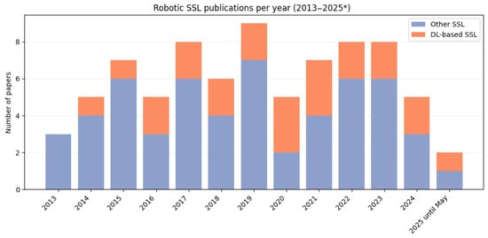 Number of robotics SSL publications with DL (orange) and non-DL approaches (blue).