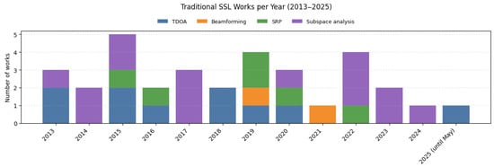Number of robotics SSL publications using: time difference of arrival (TDOA) (blue column), beamforming (orange column), steered response power (SRP) (green column), and subspace analysis (purple column).