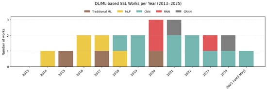 Looking at Figure 3 shows that regarding traditional SSL, subspace analysis is the most frequently used approach across the years, with TDOA also popular—especially before 2020. However, SRP and beamforming appear less often, particularly in recent years. For DL/ML-based works (Figure 4), traditional ML and MLP models are more common before 2018; after that, most studies adopt CNNs, RNNs, or hybrid CRNNs. CNNs in particular account for most DL-based papers after 2019, indicating a shift from dense-layer MLPs toward convolutional architectures. Using recurrent neural layers after dense layers (RNNs) and convolutional layers (CRNNs) have also been frequently reported in SSL tasks in robotics in recent years.
