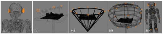 Arbitrary geometries: This refers to microphone configurations where the individual microphone elements are positioned without adherence to the particular geometric arrays. The placement might be dictated by factors external to optimal acoustic design, such as the physical constraints of a platform, aesthetic considerations, the repurposing of existing sensors, or opportunistic placement in an environment. In robotics, microphones could be placed in different parts of the body, as can be seen in Figure 5e, e.g., the head, torso, and limbs of a humanoid robot [,] or distributed inside the room [,]. The irregular microphone placements have also been implemented in non-humanoid such as a hose-shaped robot [,].