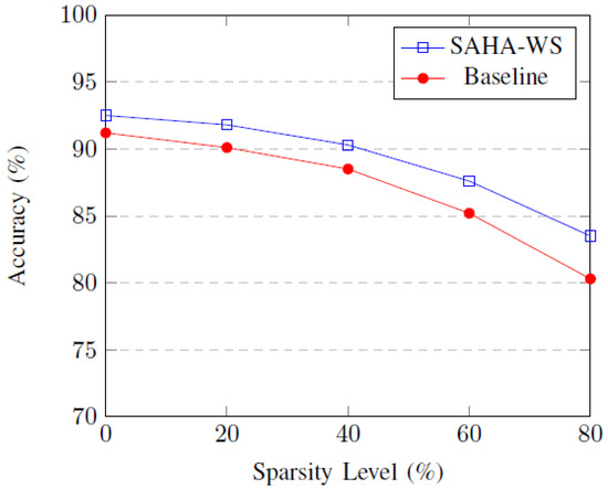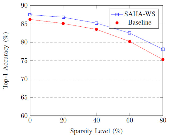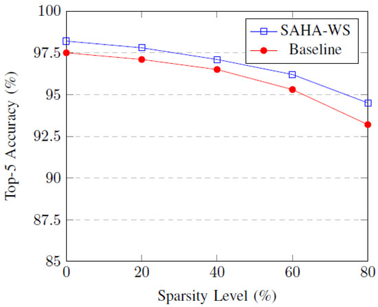 Figure 4 shows top-5 accuracy, with SAHA-WS at 96.2 ± 0.7% vs. 95.3 ± 0.9% for the baseline at 60% sparsity (p < 0.05). SAHA-WS maintains higher accuracy, leveraging sparsity-aware CNN-GCN integration [30].