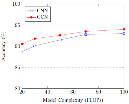 Figure 10 shows accuracy vs. model complexity (FLOPs). Both CNN and GCN architectures increase accuracy with complexity (e.g., GCN-5: 94.0 ± 0.5% at 100 FLOPs), but diminishing returns occur beyond 70 FLOPs, suggesting optimal configurations (e.g., CNN-4, GCN-4) for AR [9,46].