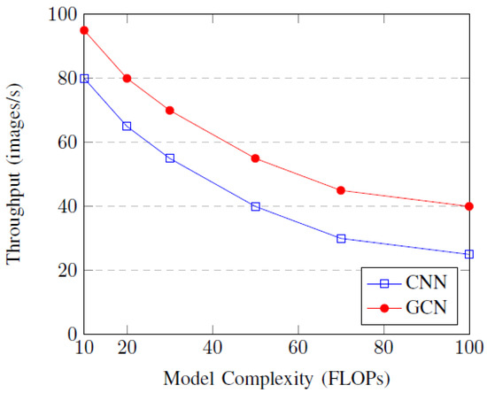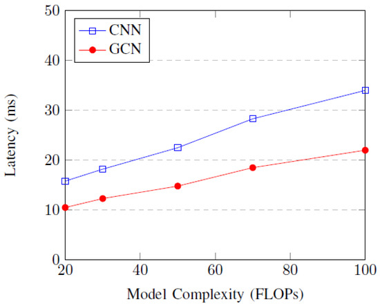 Figure 11 shows latency vs. complexity, with CNN-5 at 28.3 ± 0.8 ms and GCN-5 at 18.5 ± 0.6 ms at 100 FLOPs, reflecting increased computations (O(C ·H ·W ·K2 ·C′) for CNNs, O(|E|·F) for GCNs [15,19]). GCNs are faster due to sparsity-aware design [17].
