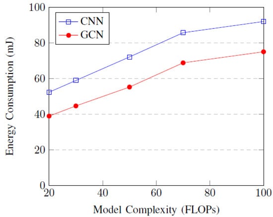 Figure 12 shows energy consumption, with CNN-5 at 85.7 ± 2.0 mJ and GCN-5 at 68.8 ± 1.7 mJ at 100 FLOPs. Power profiling confirms higher draw for complex models, but quantization reduces CNN-5 energy to 72.8 mJ [14,17].