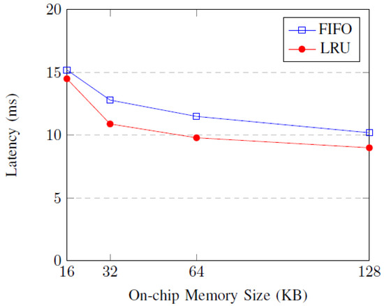 Figure 14 shows latency vs. memory size, with LRU at 64 KB (DF-5: 9.8 ± 0.3 ms) outperforming FIFO (11.5 ± 0.4 ms) by 15%, due to efficient data movement scheduling (Algorithm 3, O(|V|log|V| + |E|) complexity) [20].