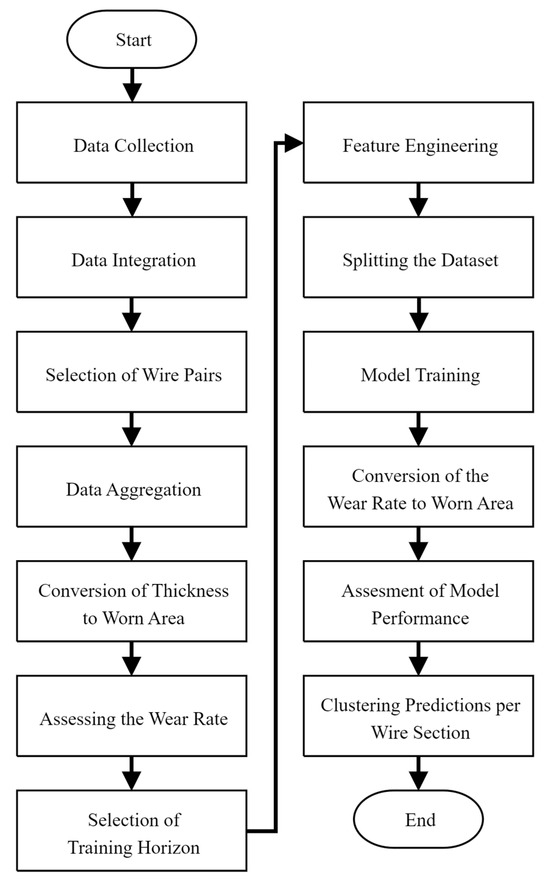 Nowadays, asset owners collect a wide array of valuable data about the train passages and many other parameters (e.g., age, current thickness, applied force, etc.) about the train track [20]. This data could be used to develop data-driven models that capture many wear scenarios and mechanisms [32,33,34]. Several research studies have indicated how asset condition data can be leveraged to establish data-driven models for predictive maintenance [35,36,37,38,39,40]. For instance, Xu et al. [41] have shown that a data-driven condition assessment model can be developed even with a small set of annotated data. In these models, Machine Learning (ML) methods correlate diverse influential parameters with the wear/degradation mechanism based on historical data [42]. With the advent of sensory data and normalization of systematic data collection routines, railway asset managers nowadays have built up substantial databases that allow them to use more sophisticated deep learning-based models for predictive maintenance [43,44,45]. A recent research trend focused on the use of data-driven modelling for the condition assessment of catenary systems [46,47,48,49,50,51,52,53]. It is indicated that ML-based predictive maintenance is one of the top priorities in the railway sector [20,54]. Given the complexity of the catenary system, predictions can be made about the condition of different aspects. For example, Gregori et al. [47] tried to predict the contact force as an indication of the condition of the entire system. Kuznar and Lorenc [48] focused on the wear of sliding strips and successfully used ML to predict the condition of this component. Yang et al. [51] deployed a Convolutional Neural Network to detect defective droppers in the catenary system. Huang et al. [46] developed surrogate models for the assessment of the catenary system quality, evaluated in terms of energy transfer quality. However, they focused on the entire system rather than contact wires specifically. While useful, these models are not very practical for making decisions on the maintenance of wires since they do not indicate the root causes of the deteriorating quality. Additionally, they used physics-based models to generate data for the surrogate modelling. The main limitation of this approach is that since the baseline data is simulated, they inherit the intrinsic inaccuracies of the simulation models. Blanco et al. [49] used simulated data and machine learning to predict the excessive lateral displacement of the contact wire due to a faulty steady arm. While these methods are useful, from the maintenance perspective they have less relevance because the intervention strategies (replacement, repair, etc.) need to focus on specific components. Given that contact wires are one of the most significant components of the catenary system and also given that their maintenance is costly, it is imperative to be able to monitor their condition independently of the entire catenary system. To the best of the authors’ knowledge, data-driven modelling of contact wire wear is largely understudied. In a rare instance, Moussallik [55] tried to develop a condition assessment framework for contact wires using a computer vision approach. Yet again, the proposed approach is limited to the vision-based condition assessment of wires and does not focus on the prediction of their wear. Finally, Usuda [28] used Neural Network to estimate the wear rate and strain of contact wires and achieved good accuracy. However, in the absence of actual measurement data, he resorted to simulated data for the training and testing of the model. The main limitation of this approach is that the simulated data commonly do not completely represent the natural fluctuations in the data, given that they are generated based on the limited view of complex wear physics.