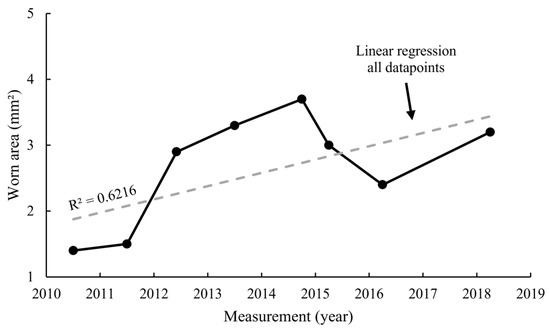 In some cases, the deviations in the data are too large to fit a reliable wear rate. These cases could be detected by looking at the R2 score which is given for the fitted regression line. If the R2 score is low, the regression line does not represent the data well, which is in most cases caused by extreme noise. The slope of the fitted regression line is a second indicator to detect unreliable results. A line could be fitted with a slope that suggests a negative wear rate. This is physically impossible as the worn area can only increase. One possible scenario for such cases is a replacement of the wire. Wire replacements are not registered in a structured way and can thus only be detected properly by analyzing the data throughout the years. Another reason for an unreliable wear rate is the number of available data points. The more data points, the higher the reliability of the wear rate generated by linear regression. For reliable wear rates, the data must thus be filtered on reasonable R2 scores, positive slopes and the minimum number of available data points. For this research, R2 scores below 0.4 are removed. The same is applied for negative wear rates and locations with less than 8 data points.
