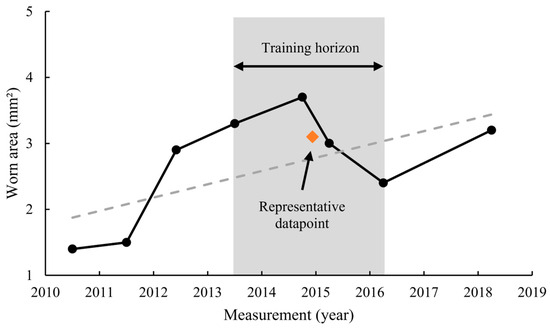 - Historical trend: Based on the data points used for the input of the model, a wear rate trend can be created for this specific period. With linear regression, a trend line can be calculated based on the worn area for the selected data points. The historical trend is used as a feature which is an indication of the expected wear rate for an extended time. Increasing the number of used data points will improve the stability and accuracy of the slope. The R2 score of the regression line is also used as a feature to indicate the reliability of the slope. This feature must not be confused with the label of the model. Both apply the same principle; however, this feature only uses the data points of the input horizon instead of all data points.