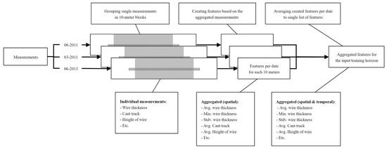 Figure 8 presents the feature engineering that is undertaken at this point. As mentioned before, the data in the training horizon needs to be aggregated. But as explained in Section 2.4, each data point is already the result of aggregating raw measurements over a length of 10 m. In the next step, the spatially aggregated data need to be re-aggregated temporally so that one set of features would represent the training horizon. The features from multiple dates are combined by taking the average of all dates. At this point, every 10 m block has a single list of features that can be used as an input for the model. Other than the fact that the conversion from a time series into a single point allows for a more straightforward machine learning method, the features are also less sensitive to noise. In a nutshell, this feature engineering pipeline ultimately represents the average wear rate of wires given the average condition they have undergone over the training horizon.