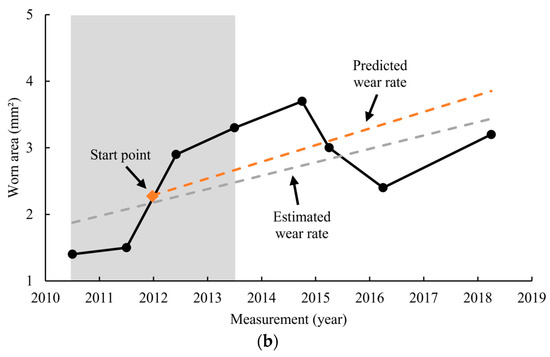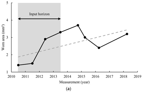 To determine the long-term performance of the model, the models are tested on a subset of data points. From the data of each block of 10 m, only a portion of the points are used for the prediction. In the example of Figure 9a, the first four data points are used as input for the model. The four data points create the feature values which are used by the model to generate a predicted wear rate, similar to what is shown in Figure 7. These wear rates are projected into the future. In other words, the model does not have any knowledge about what is happening within the ‘prediction horizon’ and is only meant to compare the prediction with the actual values. This is done to make sure the testing of the model is done with a similar scope of input information as the training data.