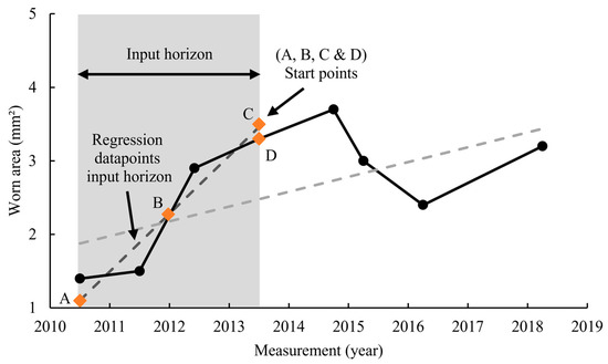 The model gives a predicted wear rate as an output, as shown in Figure 9b. This predicted wear rate is a single value and appears as a slope when plotted against time. However, for maintenance purposes, the most defining factor is the residual wire area. Therefore, it is important to translate this wear rate back into the current worn area. However, as shown in Figure 9b, for the wear rate to be converted into a worn area, a starting point needs to be determined. This is because the wear rate only implies the slope of the degradation, and in order to be able to determine the worn area, a starting point is needed. This starting point can be either based on measured data or estimated data. If actual measurement data is used, the potential measurement error would have an impact on the prediction of the worn area. However, if an estimated value is used, the random measurement errors can be diluted through data processing (e.g., regression or averaging). In this study, 4 different starting points are tested. The simplest starting point is the last measured worn area within the input horizon (i.e., Point D in Figure 10) and is referred to as the ‘last’ point in the rest of the paper. Because noise can make this last data point unreliable, another alternative can be to first fit a regression line on the data points in the input horizon and then find the last point on this line. This starting point is called the ‘last trend’ and is shown as Point C in Figure 10. The same can be done for the first data point on the fitted line (i.e., Point A in Figure 10), which is labelled as ‘first trend’ hereafter. The last possible starting point can be the average of all the data points in the input horizon. This is shown as Point B in Figure 10.