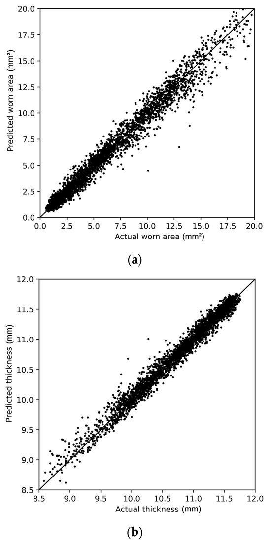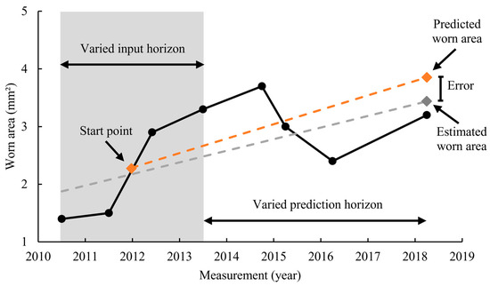 As mentioned before, the defining factor for maintenance is the worn area of the wire. Therefore, it is important to assess the performance of the model in terms of the accuracy of the worn area prediction. To measure the difference between the predicted and estimated worn area, the two values can be compared. This comparison takes place at the latest measurement point, as shown in Figure 11. The estimated worn area is considered to be the actual worn area and is based on the regression line, which is also used as the label of the model. The error of the prediction must be minimized and is quantified by the MAE, MSE, RMSE and R2 metrics.